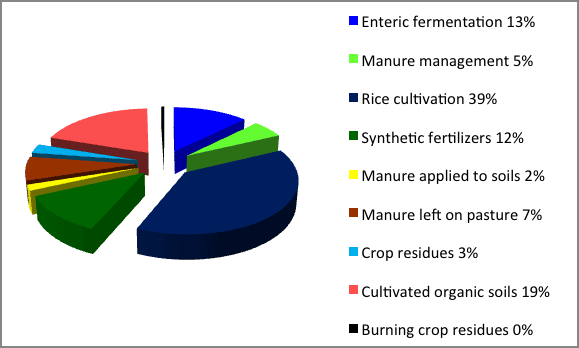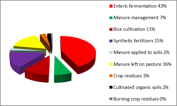 Data concerning global agricultural emissions issued by FAO (2013) shows (Figure 12) that the sources of global agricultural GHG emissions are enteric fermentation (43 percent), manure left on pasture (16 percent), the use of synthetic fertilizers (15 percent), rice cultivation (11 percent), manure management (7 percent), crop residues (3 percent), manure applied to soils (2 percent), cultivated organic soils (2 percent) and burning crop residues.