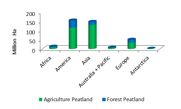 Of the peat land used for agriculture (Figure 10), most of the 296.3 million ha is in the Asian region, followed by the American region. Russia, which has about 137 million hectares of peatland, uses 130 million hectares, about 94 percent, for agriculture.