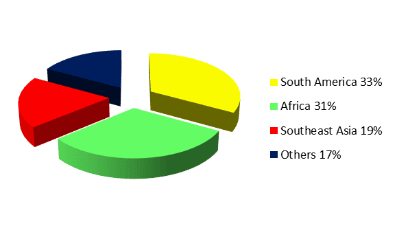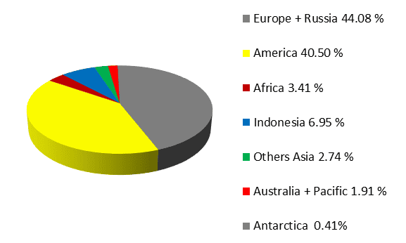 Based on data of Wetland International (2008), global peat land areas total 381.4 million hectares, which are divided (Figure 7) among Europe and Russia (44.08 percent), the Americas(40.5 percent), Africa (3.41 percent), Indonesia (6.95 percent), others Asia (2.74 percent), Australia and Pacific (1.91 percent) and Antarctica (0.41 percent).