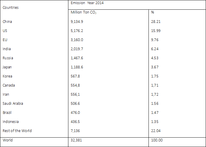 Indonesia is not the biggest global GHG emitter in the energy sector. On the contrary, Indonesia is one of the lowest emitting countries in the global energy sector. According to IEA data (2016), out of the 32.38 billion tons of CO2GHG emissions from global energy use in 2014 (Table 1) about 28 percent was produced by China, followed by the United States (16 percent) and the European Union (10 percent).