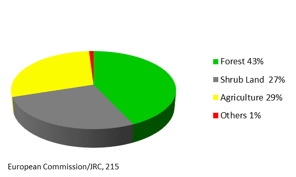 The interesting thing to learn is the distribution of fires based sector and land use (Figure 14). About 70 percent of fires in Europe and North Africa hit forests, timber estates and natural land and about 29 percent of fires take place on agriculture land. This shows that forest areas are the most being gutted by fire in each country.