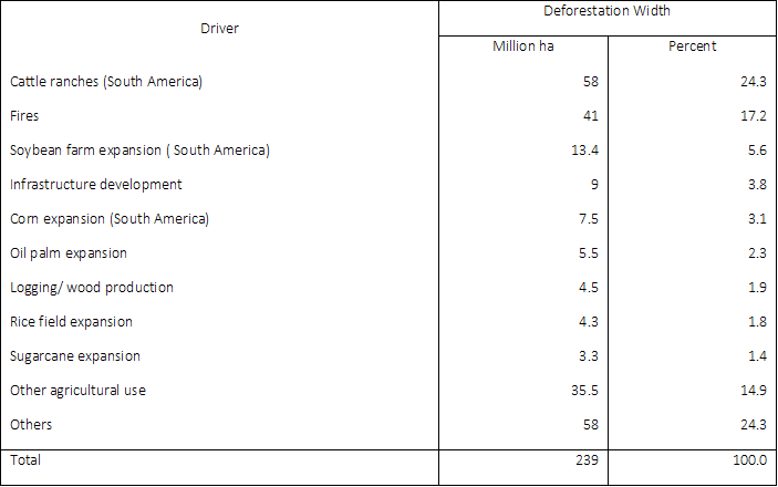 The scale of global deforestation in 1980 had already reached 701 million hectares (Matthew, 1983). Then in the 1990-2008 periods the total global deforestation was 239 million hectares (European Commission, 2013).