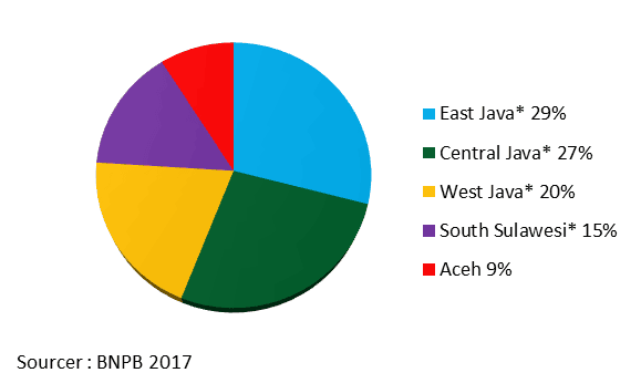 Based on data from the National Disaster Mitigation Agency (BNPB, 2017), the provinces most vulnerable to drought in the 2010-2016 period were East Java (29 percent), Central Java (27 percent), West Java (20 percent), South Sulawesi (15 percent) and Aceh (9 percent) (Figure 17).