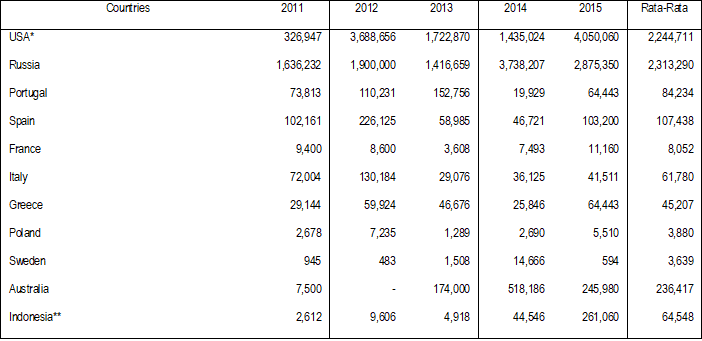 From 2010 to 2015, for example (Table 6), the average extent of forest and land fires in various countries remained high. In some countries they are even more extensive than in Indonesia. The area of forest and land fires in Russia reaches about 2.3 million ha each year; in the US it reaches 2.2 million