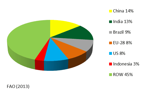 Data of global agricultural GHG emissions issued by FAO (2013) shows (Figure 11) that the main contributors of global agricultural GHG are the agriculture of China (14 percent), India (13 percent), Brazil (9 percent), the European Union (8 percent) and the US (8 percent). The five countries contribute 52 percent of total agricultural GHG emissions.
