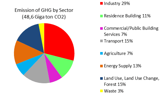 Therefore it is very clear that the largest GHG-emission contributor is from energy consumption (BBF) by industry, transportation, housing, offices and energy supply, which account for 75 percent of the global GHG emissions. The share of agriculture, land use, land use change and forest (LULUCF) is only about 22 percent. If the global community wants to resolve global warming, the most effective way is by reducing the BBF consumption globally and in a revolutionary way.