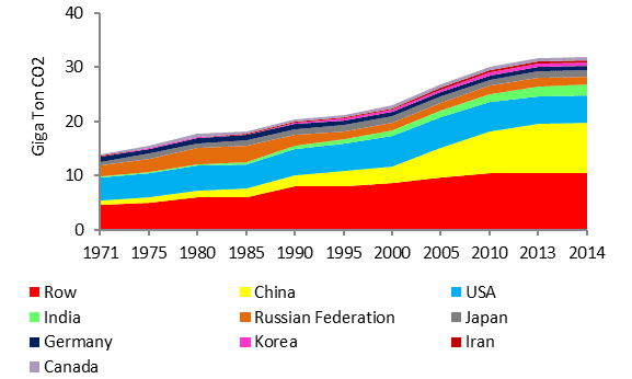 Global GHG emissions until 2014 reached about 32.4 gigatons of CO2. Based on data from the IEA (2016) the largest GHG emitting countries (Figure 3) are China (28 percent), US (16 percent), India (6.2 percent) and Russia (5 percent).