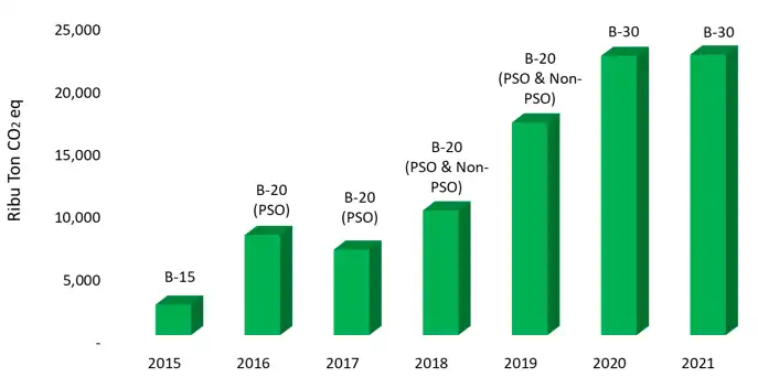Dengan perubahan mandatori biodiesel dari B10 ke B30, penghematan emisi GRK meningkat dari hanya sekitar 592.3 ribu ton CO2 eq tahun 2010 menjadi 22.4 juta ton CO2 eq tahun 2021 (PASPI Monitor, 2021a). Penghematan emisi akibat mandatori B30 tersebut mampu menyumbang 59 persen pencapaian target NDC dari sektor energi dan transportasi pada tahun 2020-2021.