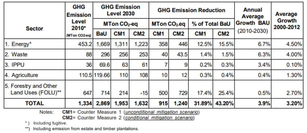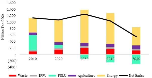 Sehubungan dengan hal tersebut, Pemerintah Indonesia telah menyusun target inisiatif untuk penurunan emisi yakni NDC (Gambar 2) yakni dengan menurunkan emisi Indonesia menjadi 1.6 Gt CO2 eq pada tahun 2030. Penurunan emisi tersebut berasal dari penurunan emisi sektor energi menjadi 1.2 Gt ton CO2 eq, emisi sektor limbah menjadi 253 juta ton CO2 eq, emisi sektor pertanian menjadi 108 juta ton CO2 eq, emisi sektor IPPU menjadi 61 juta ton CO2 eq, dan emisi sektor FOLU menjadi negatif 15 juta ton CO2 eq.