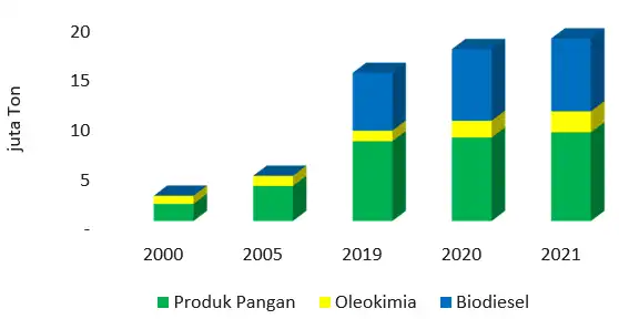 Hilirisasi di dalam negeri yang terus berkembang mengakibatkan peningkatan konsumsi domestik minyak sawit (Gambar 1.5). Pada tahun 2021, urutan penggunaan terbesar konsumsi minyak sawit (CPO+CPKO) domestik yakni industri pangan sebesar 8.9 juta ton (49 persen), industri biodiesel 7.3 juta ton (40 persen), dan industri oleokimia 2.1 juta ton (11 persen). Hal ini menunjukkan bahwa hilirisasi sawit di dalam negeri masih didominasi untuk produk pangan.