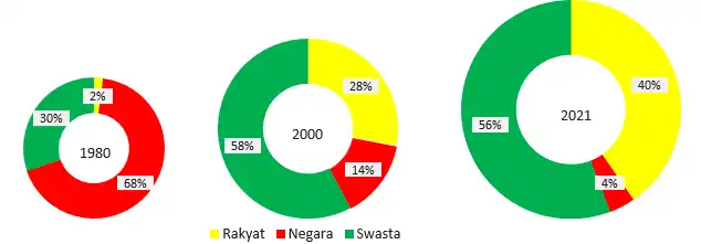 Selain pertumbuhannya yang revolusioner, hal lain yang mengesankan adalah pertumbuhan perkebunan kelapa sawit rakyat yang relatif cepat. Selama periode tahun 1980-2021, pangsa perkebunan kelapa sawit rakyat meningkat dari hanya sekitar 2 persen menjadi 40 persen (Gambar 1.2). Pangsa perkebunan kelapa sawit swasta juga meningkat dari 30 persen menjadi 56 persen. Sementara itu, meskipun luas perkebunan kelapa sawit negara secara absolut meningkat, namun pangsanya menurun dari 68 persen menjadi 4 persen.