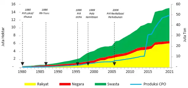 Luas perkebunan kelapa sawit Indonesia meningkat dari sekitar 294.5 ribu hektar pada tahun 1980 menjadi sekitar 15.1 juta hektar pada tahun 2021. Demikian juga dengan volume produksi CPO meningkat dari sekitar 721.2 ribu ton menjadi 49.7 juta ton pada periode yang sama.